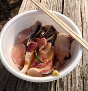 道を歩いていると露店が出ていてお姉さんに「今日のとれたてお刺身丼いかがですか?」と誘惑が